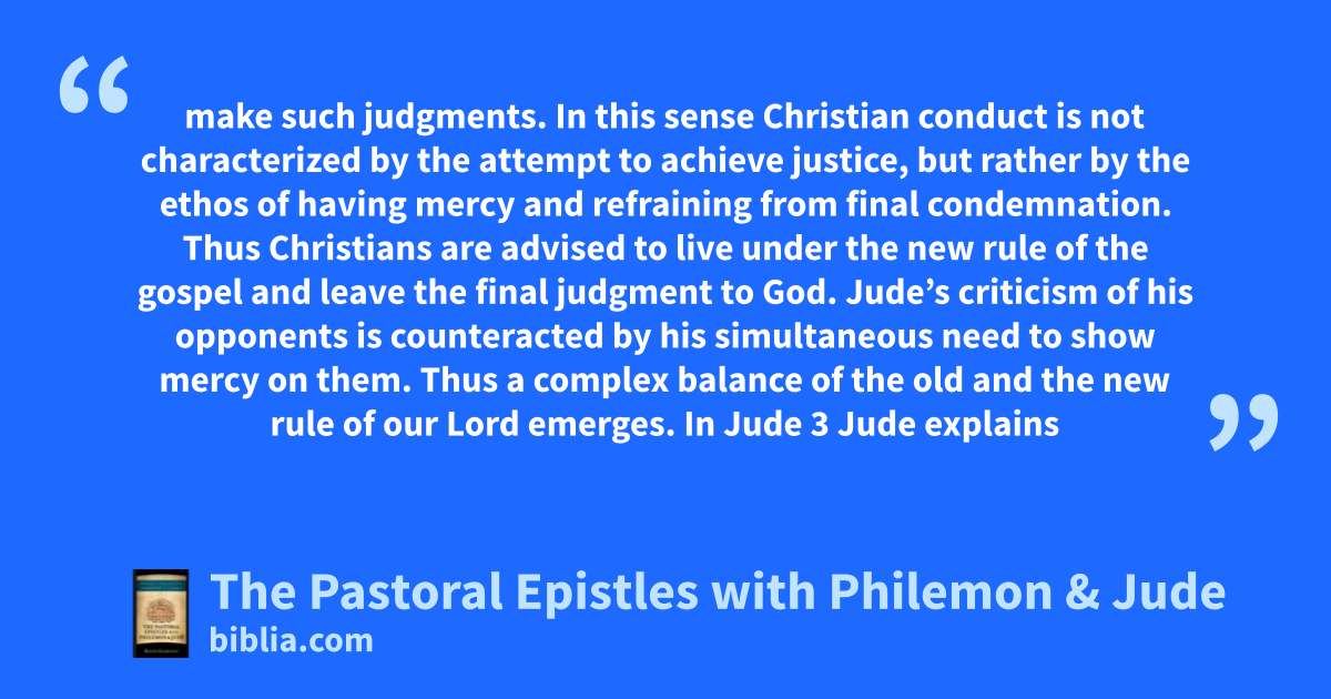 make such judgments. In this sense Christian conduct is not characterized by the attempt to achieve justice, but rather by the ethos of having mercy and refraining from final condemnation. Thus Christians are advised to live under the new rule of the gospel and leave the final judgment to God. Jude’s criticism of his opponents is counteracted by his simultaneous need to show mercy on them. Thus a complex balance of the old and the new rule of our Lord emerges. In Jude 3 Jude explains