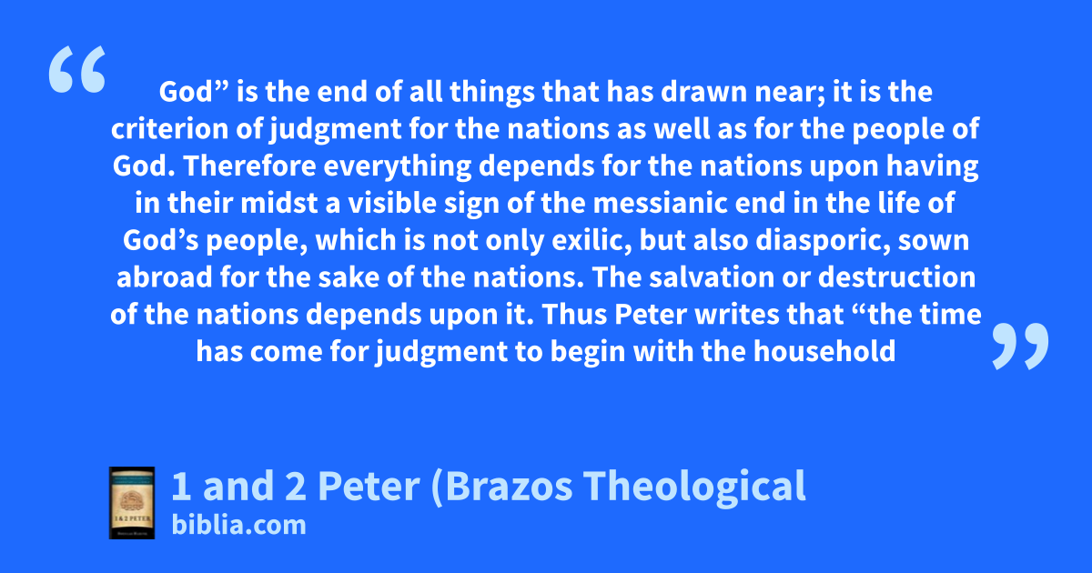 God” is the end of all things that has drawn near; it is the criterion of judgment for the nations as well as for the people of God. Therefore everything depends for the nations upon having in their midst a visible sign of the messianic end in the life of God’s people, which is not only exilic, but also diasporic, sown abroad for the sake of the nations. The salvation or destruction of the nations depends upon it. Thus Peter writes that “the time has come for judgment to begin with the household