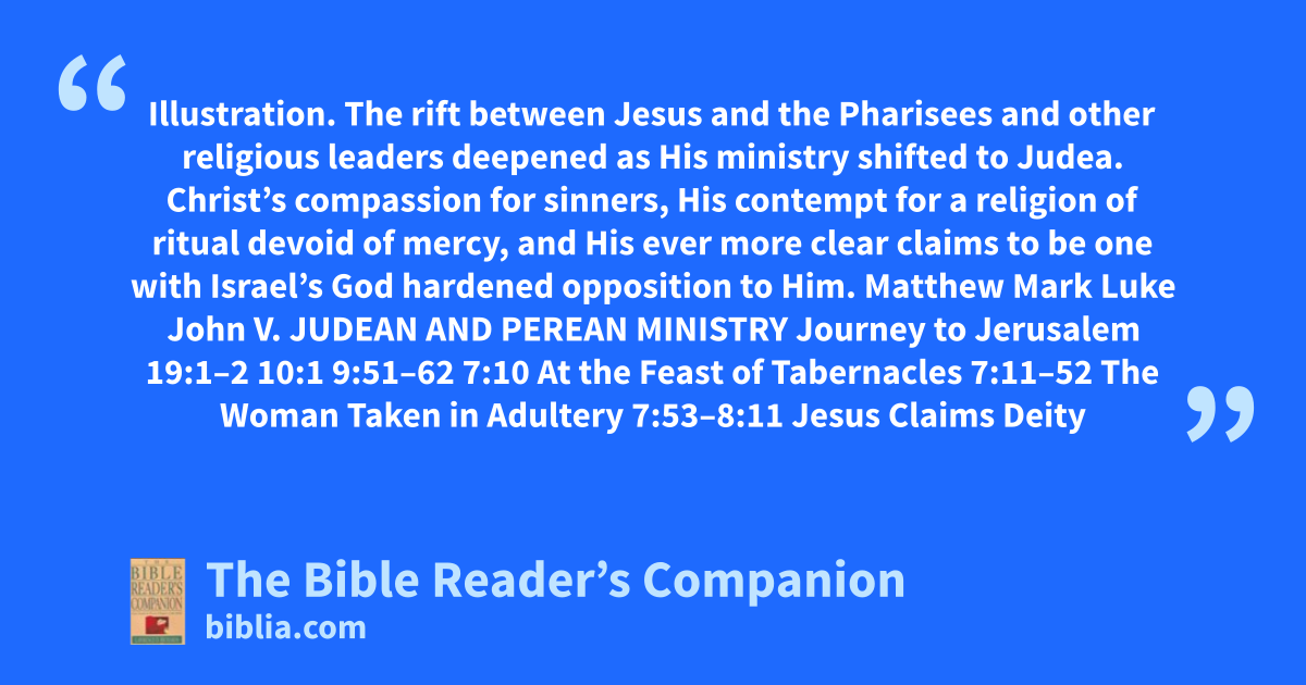 Illustration. The rift between Jesus and the Pharisees and other religious leaders deepened as His ministry shifted to Judea. Christ’s compassion for sinners, His contempt for a religion of ritual devoid of mercy, and His ever more clear claims to be one with Israel’s God hardened opposition to Him. Matthew Mark Luke John V. JUDEAN AND PEREAN MINISTRY Journey to Jerusalem 19:1–2 10:1 9:51–62 7:10 At the Feast of Tabernacles 7:11–52 The Woman Taken in Adultery 7:53–8:11 Jesus Claims Deity