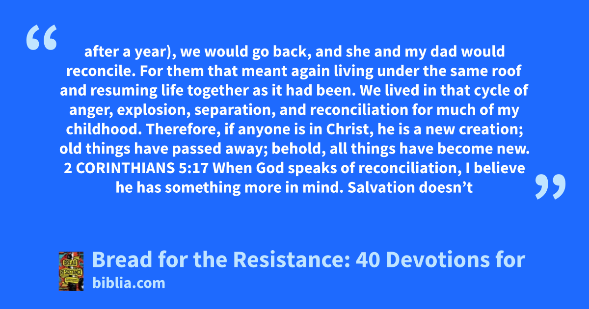 after a year), we would go back, and she and my dad would reconcile. For them that meant again living under the same roof and resuming life together as it had been. We lived in that cycle of anger, explosion, separation, and reconciliation for much of my childhood. Therefore, if anyone is in Christ, he is a new creation; old things have passed away; behold, all things have become new. 2 CORINTHIANS 5:17 When God speaks of reconciliation, I believe he has something more in mind. Salvation doesn’t