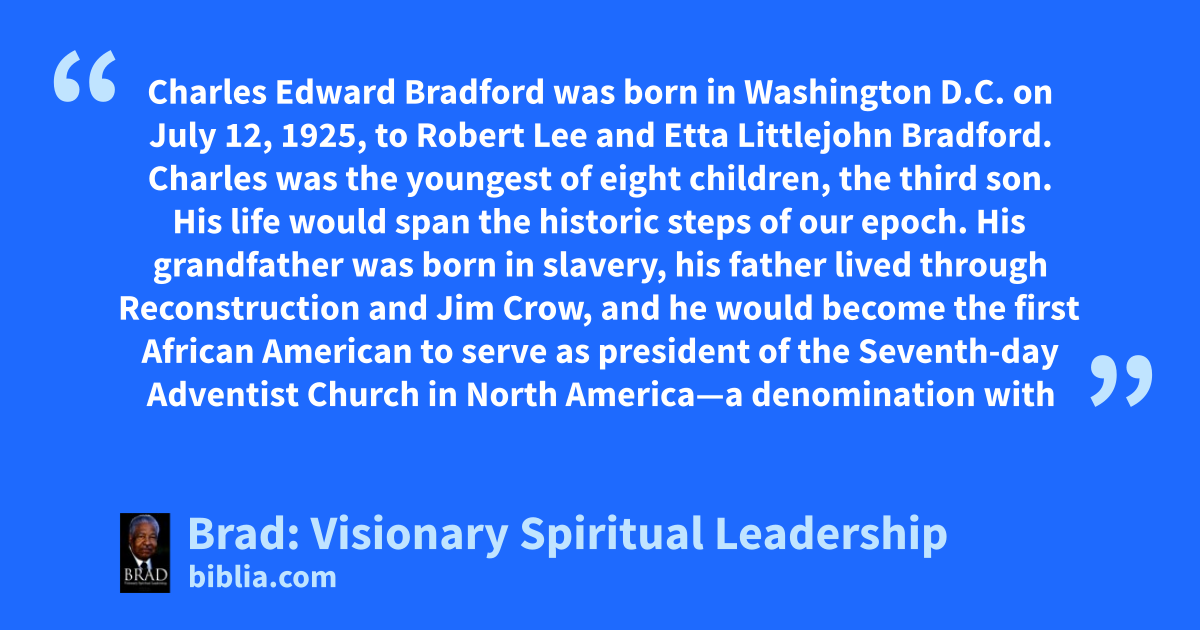 Charles Edward Bradford was born in Washington D.C. on July 12, 1925, to Robert Lee and Etta Littlejohn Bradford. Charles was the youngest of eight children, the third son. His life would span the historic steps of our epoch. His grandfather was born in slavery, his father lived through Reconstruction and Jim Crow, and he would become the first African American to serve as president of the Seventh-day Adventist Church in North America—a denomination with