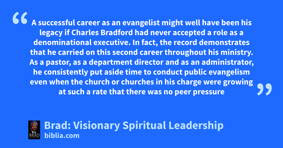 A successful career as an evangelist might well have been his legacy if Charles Bradford had never accepted a role as a denominational executive. In fact, the record demonstrates that he carried on this second career throughout his ministry. As a pastor, as a department director and as an administrator, he consistently put aside time to conduct public evangelism even when the church or churches in his charge were growing at such a rate that there was no peer pressure