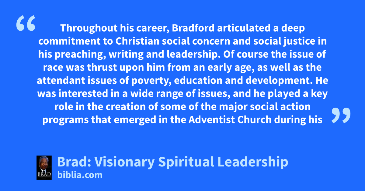 Throughout his career, Bradford articulated a deep commitment to Christian social concern and social justice in his preaching, writing and leadership. Of course the issue of race was thrust upon him from an early age, as well as the attendant issues of poverty, education and development. He was interested in a wide range of issues, and he played a key role in the creation of some of the major social action programs that emerged in the Adventist Church during his
