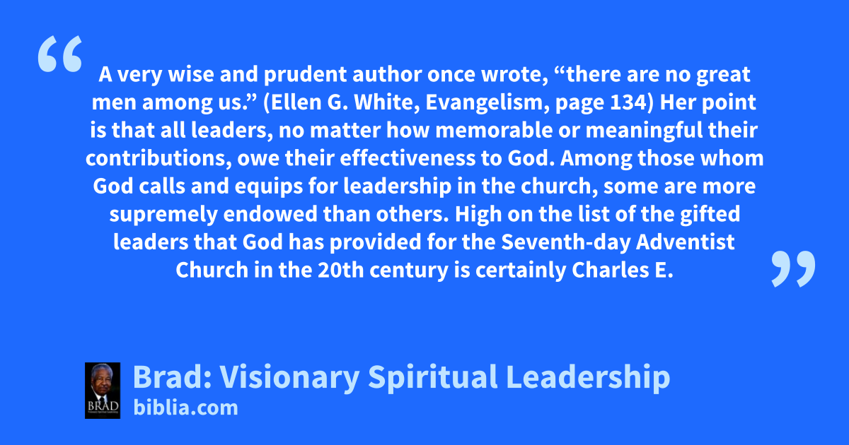 A very wise and prudent author once wrote, “there are no great men among us.” (Ellen G. White, Evangelism, page 134) Her point is that all leaders, no matter how memorable or meaningful their contributions, owe their effectiveness to God. Among those whom God calls and equips for leadership in the church, some are more supremely endowed than others. High on the list of the gifted leaders that God has provided for the Seventh-day Adventist Church in the 20th century is certainly Charles E.