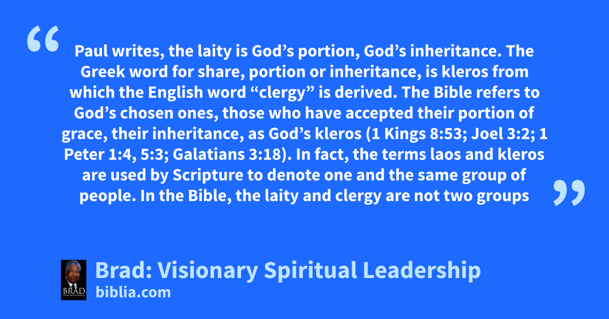 Paul writes, the laity is God’s portion, God’s inheritance. The Greek word for share, portion or inheritance, is kleros from which the English word “clergy” is derived. The Bible refers to God’s chosen ones, those who have accepted their portion of grace, their inheritance, as God’s kleros (1 Kings 8:53; Joel 3:2; 1 Peter 1:4, 5:3; Galatians 3:18). In fact, the terms laos and kleros are used by Scripture to denote one and the same group of people. In the Bible, the laity and clergy are not two groups