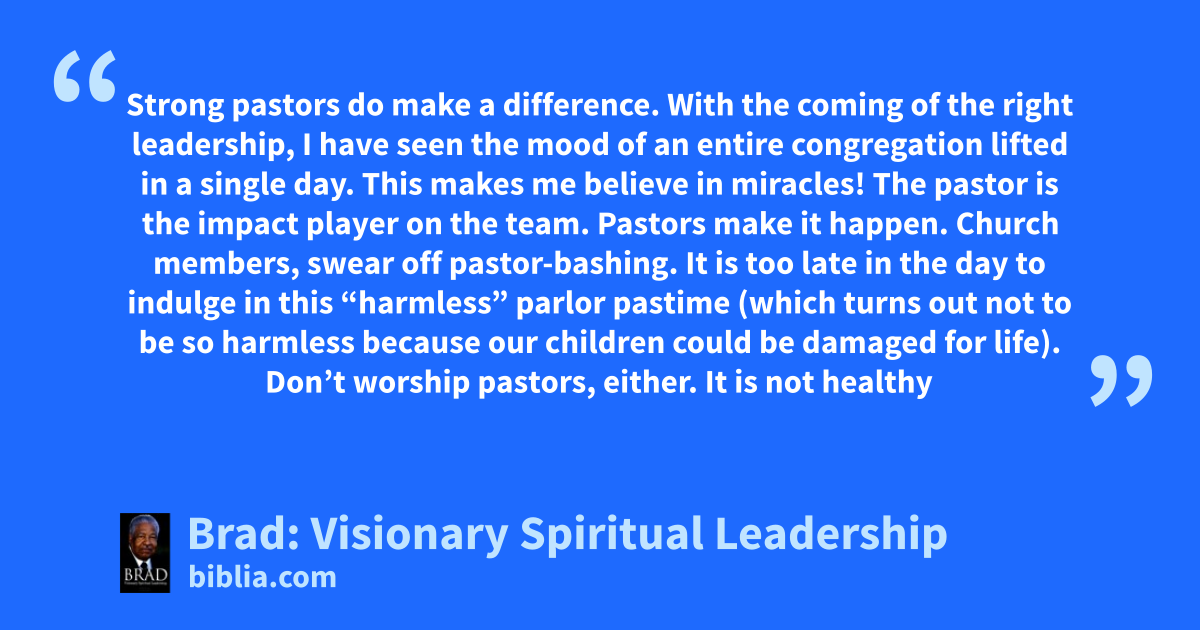 Strong pastors do make a difference. With the coming of the right leadership, I have seen the mood of an entire congregation lifted in a single day. This makes me believe in miracles! The pastor is the impact player on the team. Pastors make it happen. Church members, swear off pastor-bashing. It is too late in the day to indulge in this “harmless” parlor pastime (which turns out not to be so harmless because our children could be damaged for life). Don’t worship pastors, either. It is not healthy