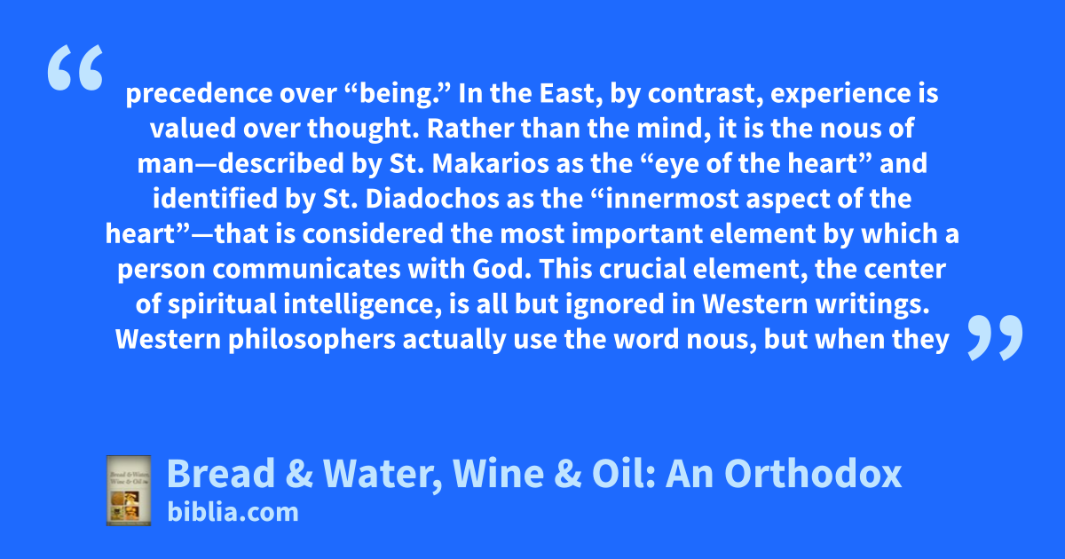 precedence over “being.” In the East, by contrast, experience is valued over thought. Rather than the mind, it is the nous of man—described by St. Makarios as the “eye of the heart” and identified by St. Diadochos as the “innermost aspect of the heart”—that is considered the most important element by which a person communicates with God. This crucial element, the center of spiritual intelligence, is all but ignored in Western writings. Western philosophers actually use the word nous, but when they
