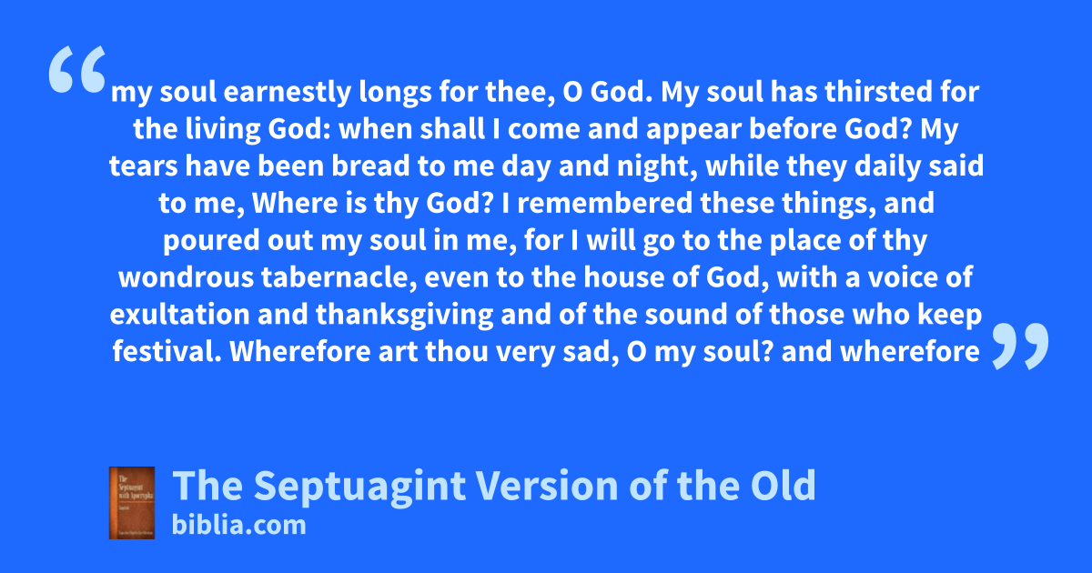 my soul earnestly longs for thee, O God. My soul has thirsted for the living God: when shall I come and appear before God? My tears have been bread to me day and night, while they daily said to me, Where is thy God? I remembered these things, and poured out my soul in me, for I will go to the place of thy wondrous tabernacle, even to the house of God, with a voice of exultation and thanksgiving and of the sound of those who keep festival. Wherefore art thou very sad, O my soul? and wherefore