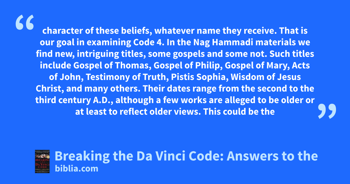 character of these beliefs, whatever name they receive. That is our goal in examining Code 4. In the Nag Hammadi materials we find new, intriguing titles, some gospels and some not. Such titles include Gospel of Thomas, Gospel of Philip, Gospel of Mary, Acts of John, Testimony of Truth, Pistis Sophia, Wisdom of Jesus Christ, and many others. Their dates range from the second to the third century A.D., although a few works are alleged to be older or at least to reflect older views. This could be the