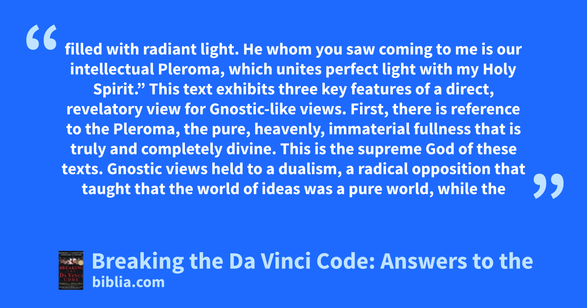 filled with radiant light. He whom you saw coming to me is our intellectual Pleroma, which unites perfect light with my Holy Spirit.” This text exhibits three key features of a direct, revelatory view for Gnostic-like views. First, there is reference to the Pleroma, the pure, heavenly, immaterial fullness that is truly and completely divine. This is the supreme God of these texts. Gnostic views held to a dualism, a radical opposition that taught that the world of ideas was a pure world, while the