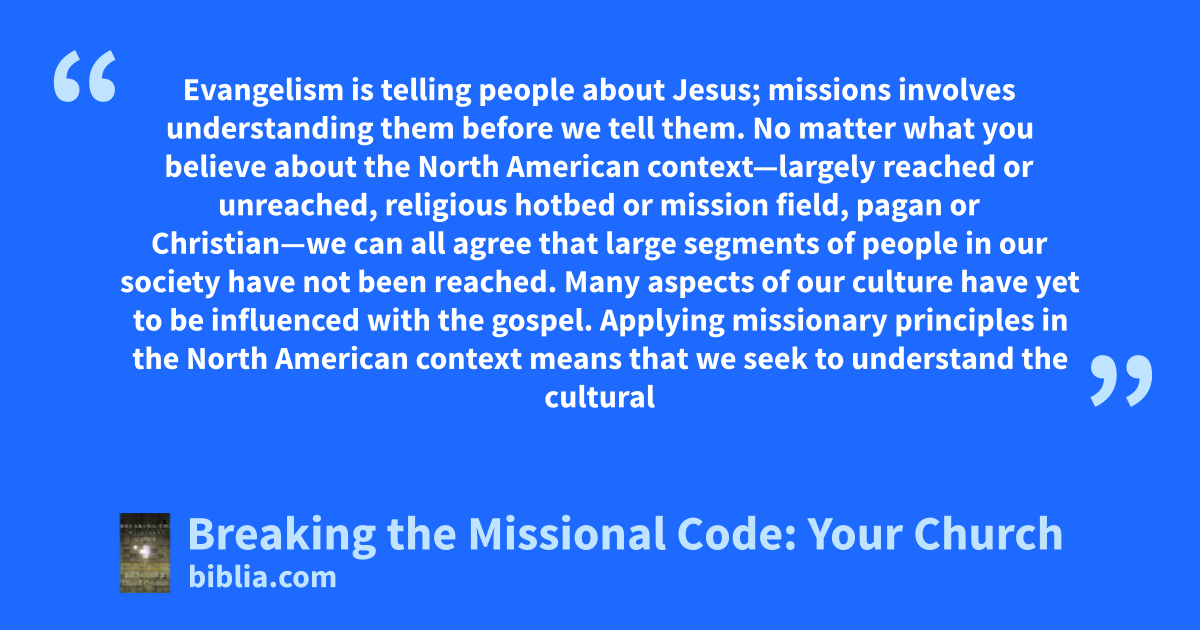 Evangelism is telling people about Jesus; missions involves understanding them before we tell them. No matter what you believe about the North American context—largely reached or unreached, religious hotbed or mission field, pagan or Christian—we can all agree that large segments of people in our society have not been reached. Many aspects of our culture have yet to be influenced with the gospel. Applying missionary principles in the North American context means that we seek to understand the cultural