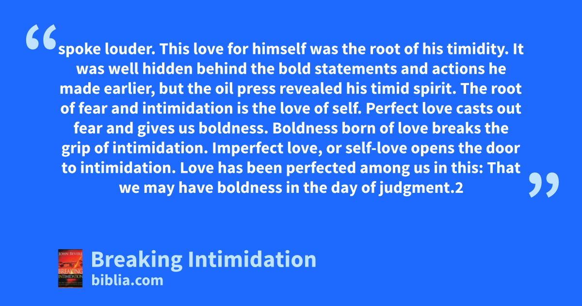 spoke louder. This love for himself was the root of his timidity. It was well hidden behind the bold statements and actions he made earlier, but the oil press revealed his timid spirit. The root of fear and intimidation is the love of self. Perfect love casts out fear and gives us boldness. Boldness born of love breaks the grip of intimidation. Imperfect love, or self-love opens the door to intimidation. Love has been perfected among us in this: That we may have boldness in the day of judgment.2