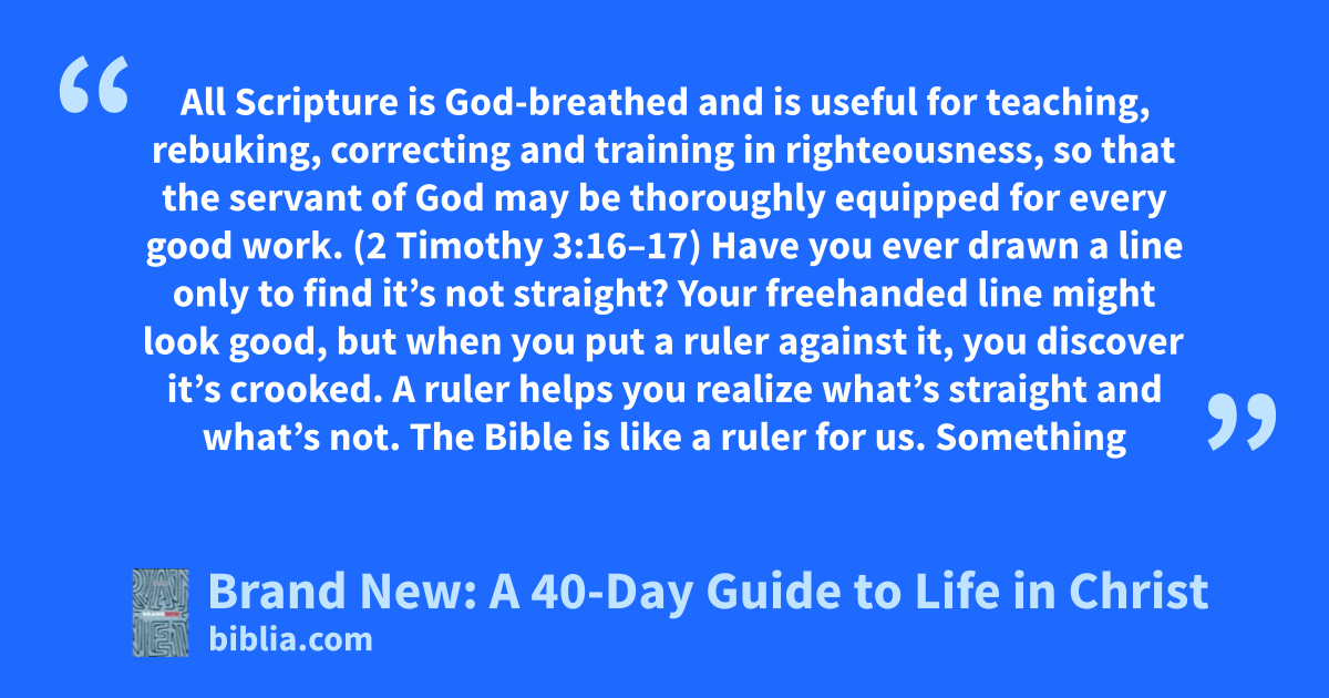All Scripture is God-breathed and is useful for teaching, rebuking, correcting and training in righteousness, so that the servant of God may be thoroughly equipped for every good work. (2 Timothy 3:16–17) Have you ever drawn a line only to find it’s not straight? Your freehanded line might look good, but when you put a ruler against it, you discover it’s crooked. A ruler helps you realize what’s straight and what’s not. The Bible is like a ruler for us. Something