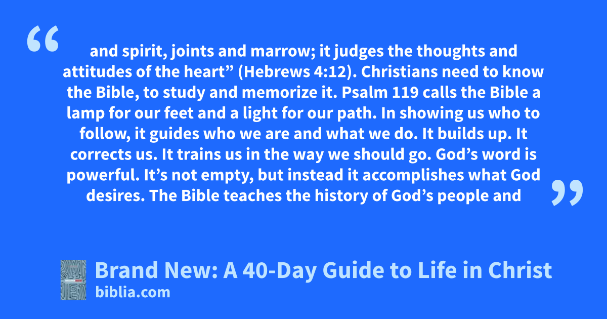 and spirit, joints and marrow; it judges the thoughts and attitudes of the heart” (Hebrews 4:12). Christians need to know the Bible, to study and memorize it. Psalm 119 calls the Bible a lamp for our feet and a light for our path. In showing us who to follow, it guides who we are and what we do. It builds up. It corrects us. It trains us in the way we should go. God’s word is powerful. It’s not empty, but instead it accomplishes what God desires. The Bible teaches the history of God’s people and