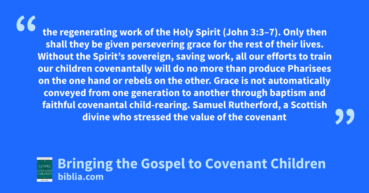 the regenerating work of the Holy Spirit (John 3:3–7). Only then shall they be given persevering grace for the rest of their lives. Without the Spirit’s sovereign, saving work, all our efforts to train our children covenantally will do no more than produce Pharisees on the one hand or rebels on the other. Grace is not automatically conveyed from one generation to another through baptism and faithful covenantal child-rearing. Samuel Rutherford, a Scottish divine who stressed the value of the covenant