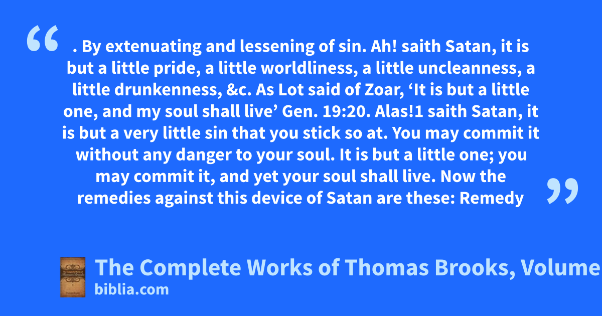 . By extenuating and lessening of sin. Ah! saith Satan, it is but a little pride, a little worldliness, a little uncleanness, a little drunkenness, &c. As Lot said of Zoar, ‘It is but a little one, and my soul shall live’ Gen. 19:20. Alas!1 saith Satan, it is but a very little sin that you stick so at. You may commit it without any danger to your soul. It is but a little one; you may commit it, and yet your soul shall live. Now the remedies against this device of Satan are these: Remedy
