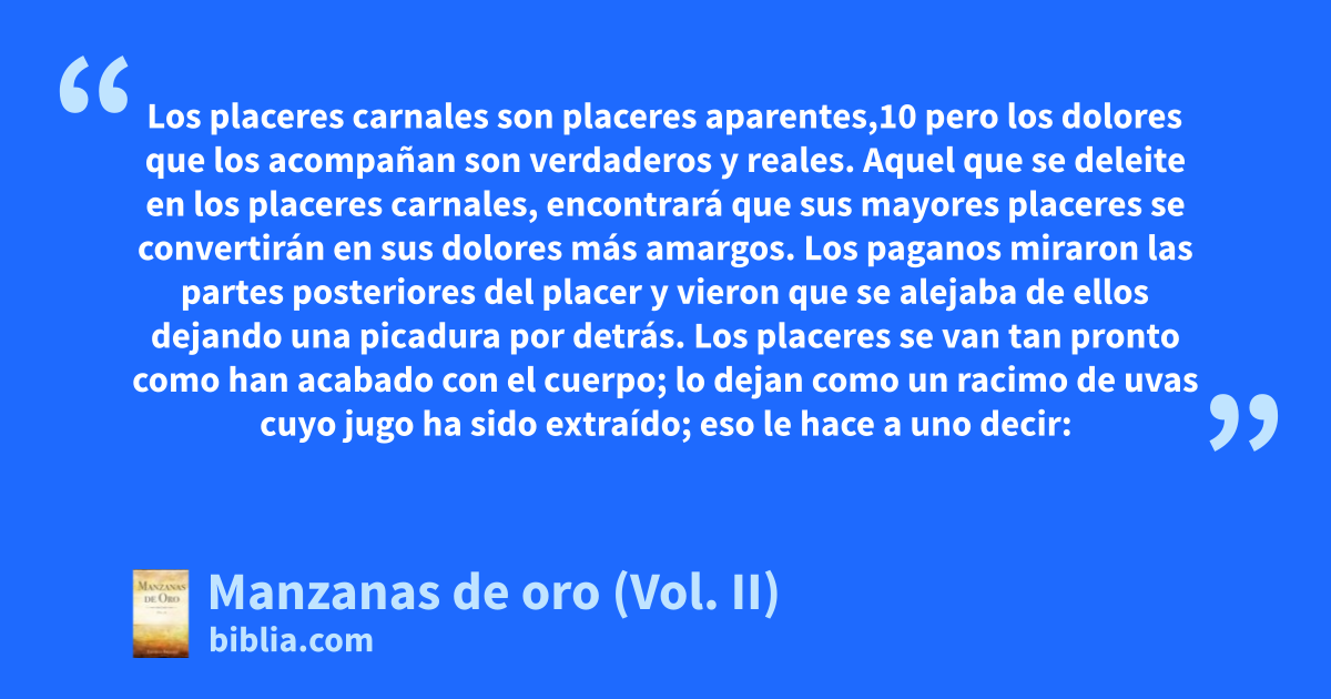 Los placeres carnales son placeres aparentes,10 pero los dolores que los acompañan son verdaderos y reales. Aquel que se deleite en los placeres carnales, encontrará que sus mayores placeres se convertirán en sus dolores más amargos.