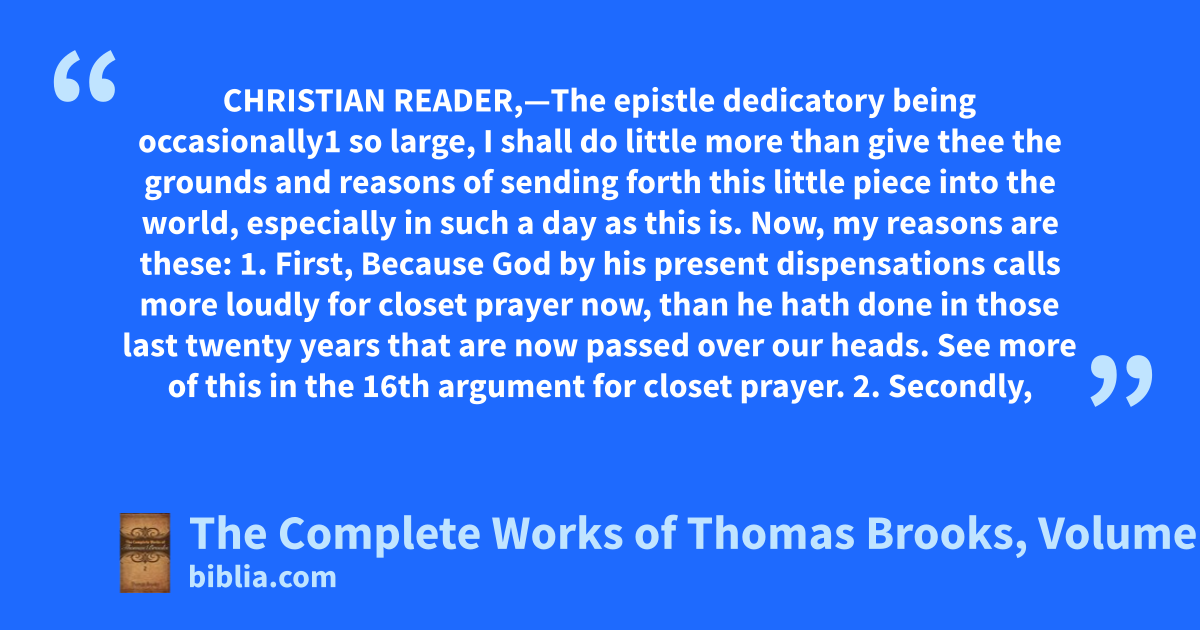 CHRISTIAN READER,—The epistle dedicatory being occasionally1 so large, I shall do little more than give thee the grounds and reasons of sending forth this little piece into the world, especially in such a day as this is. Now, my reasons are these: 1. First, Because God by his present dispensations calls more loudly for closet prayer now, than he hath done in those last twenty years that are now passed over our heads. See more of this in the 16th argument for closet prayer. 2. Secondly,