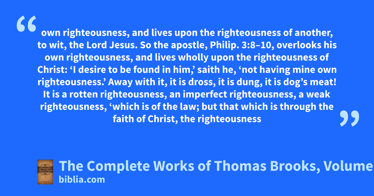 own righteousness, and lives upon the righteousness of another, to wit, the Lord Jesus. So the apostle, Philip. 3:8–10, overlooks his own righteousness, and lives wholly upon the righteousness of Christ: ‘I desire to be found in him,’ saith he, ‘not having mine own righteousness.’ Away with it, it is dross, it is dung, it is dog’s meat! It is a rotten righteousness, an imperfect righteousness, a weak righteousness, ‘which is of the law; but that which is through the faith of Christ, the righteousness
