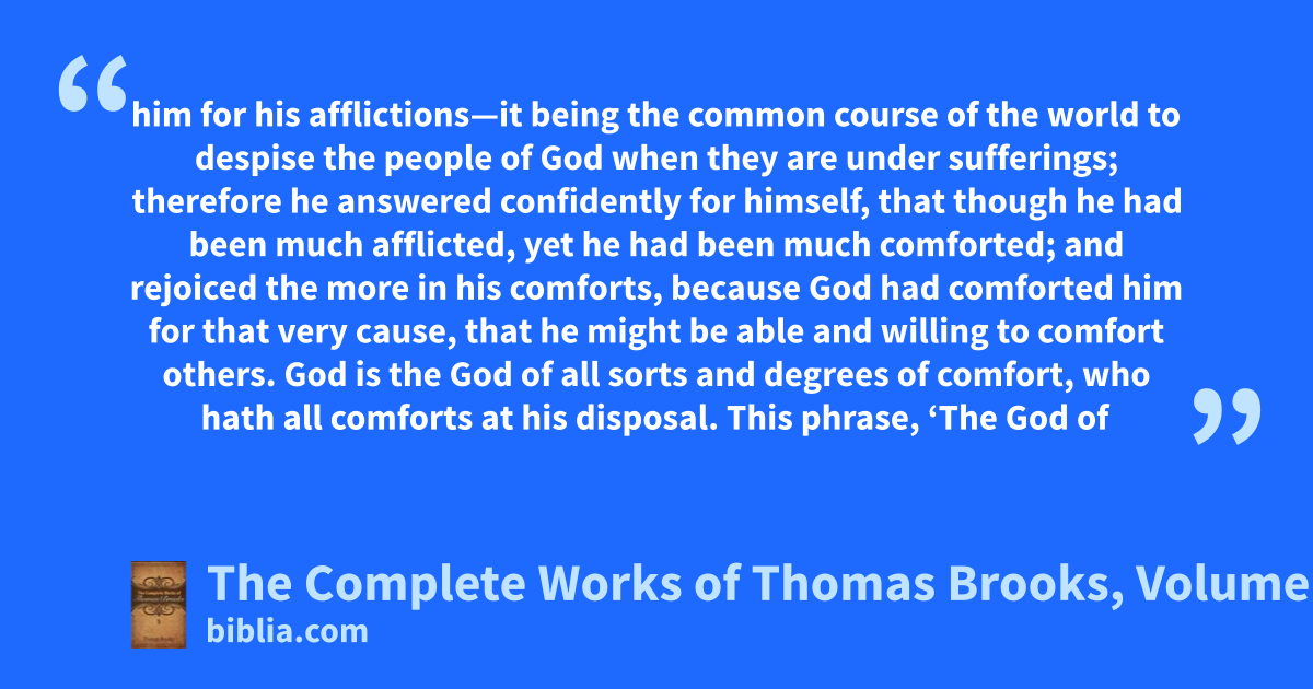 him for his afflictions—it being the common course of the world to despise the people of God when they are under sufferings; therefore he answered confidently for himself, that though he had been much afflicted, yet he had been much comforted; and rejoiced the more in his comforts, because God had comforted him for that very cause, that he might be able and willing to comfort others. God is the God of all sorts and degrees of comfort, who hath all comforts at his disposal. This phrase, ‘The God of