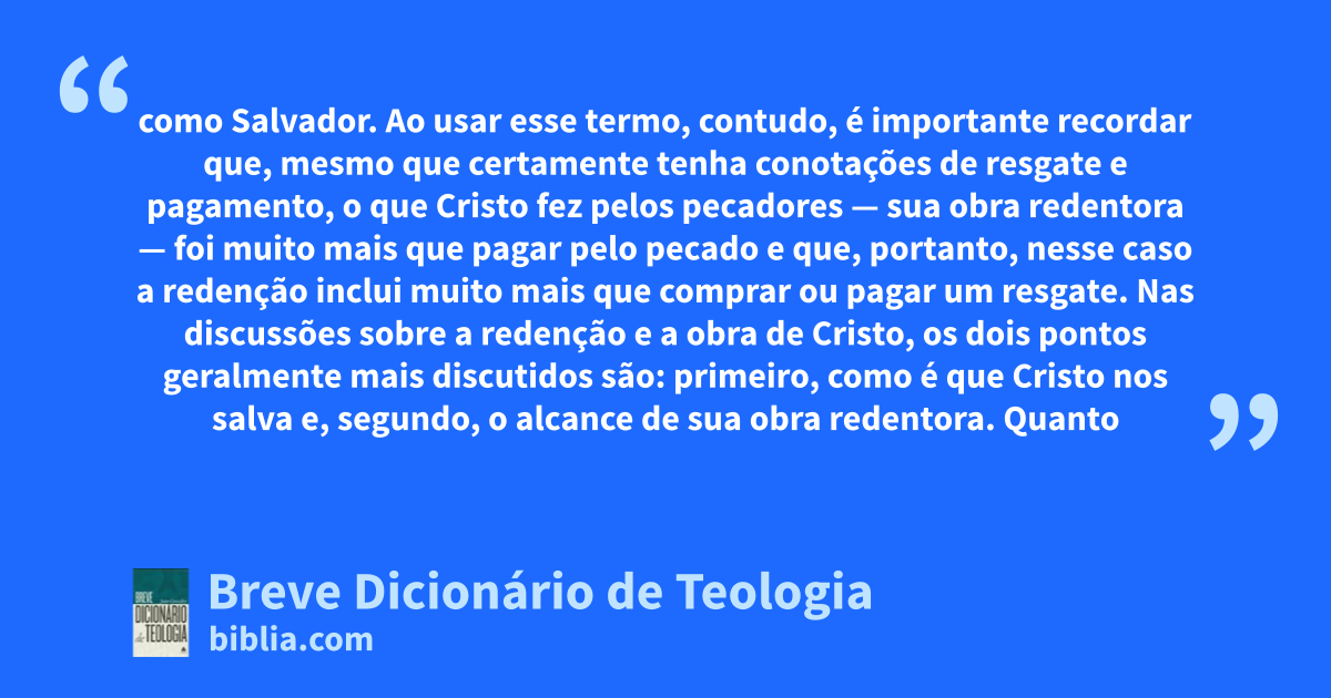 como Salvador. Ao usar esse termo, contudo, é importante recordar que, mesmo que certamente tenha conotações de resgate e pagamento, o que Cristo fez pelos pecadores — sua obra redentora — foi muito mais que pagar pelo pecado e que, portanto, nesse caso a redenção inclui muito mais que comprar ou pagar um resgate. Nas discussões sobre a redenção e a obra de Cristo, os dois pontos geralmente mais discutidos são: primeiro, como é que Cristo nos salva e, segundo, o alcance de sua obra redentora. Quanto