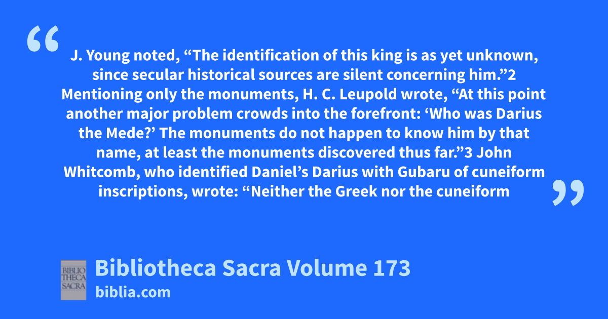 J. Young noted, “The identification of this king is as yet unknown, since secular historical sources are silent concerning him.”2 Mentioning only the monuments, H. C. Leupold wrote, “At this point another major problem crowds into the forefront: ‘Who was Darius the Mede?’ The monuments do not happen to know him by that name, at least the monuments discovered thus far.”3 John Whitcomb, who identified Daniel’s Darius with Gubaru of cuneiform inscriptions, wrote: “Neither the Greek nor the cuneiform