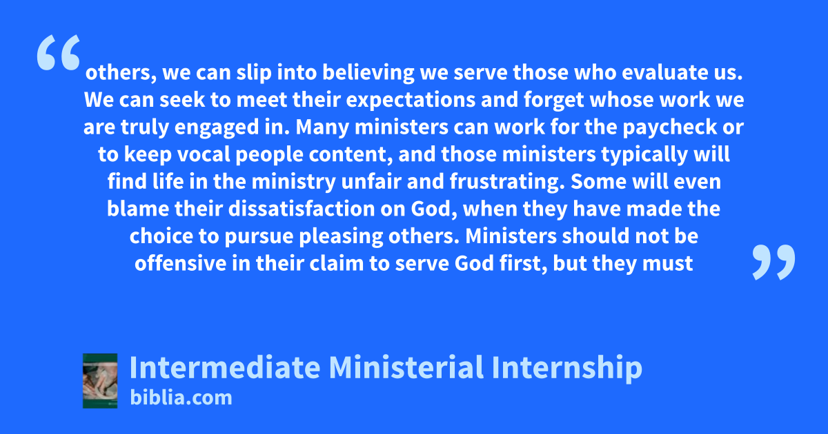 others, we can slip into believing we serve those who evaluate us. We can seek to meet their expectations and forget whose work we are truly engaged in. Many ministers can work for the paycheck or to keep vocal people content, and those ministers typically will find life in the ministry unfair and frustrating. Some will even blame their dissatisfaction on God, when they have made the choice to pursue pleasing others. Ministers should not be offensive in their claim to serve God first, but they must