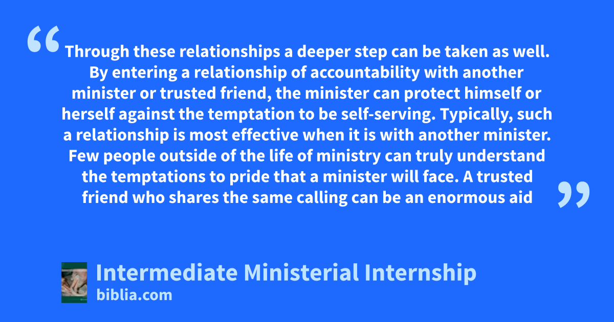 Through these relationships a deeper step can be taken as well. By entering a relationship of accountability with another minister or trusted friend, the minister can protect himself or herself against the temptation to be self-serving. Typically, such a relationship is most effective when it is with another minister. Few people outside of the life of ministry can truly understand the temptations to pride that a minister will face. A trusted friend who shares the same calling can be an enormous aid