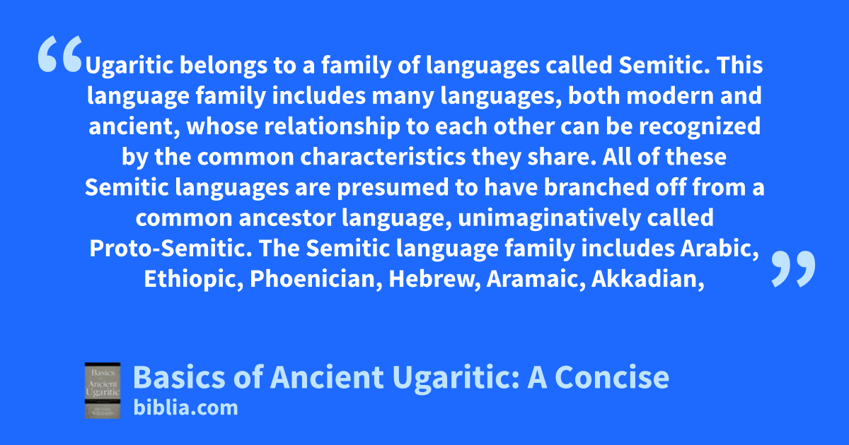 Ugaritic belongs to a family of languages called Semitic. This language family includes many languages, both modern and ancient, whose relationship to each other can be recognized by the common characteristics they share. All of these Semitic languages are presumed to have branched off from a common ancestor language, unimaginatively called Proto-Semitic. The Semitic language family includes Arabic, Ethiopic, Phoenician, Hebrew, Aramaic, Akkadian,