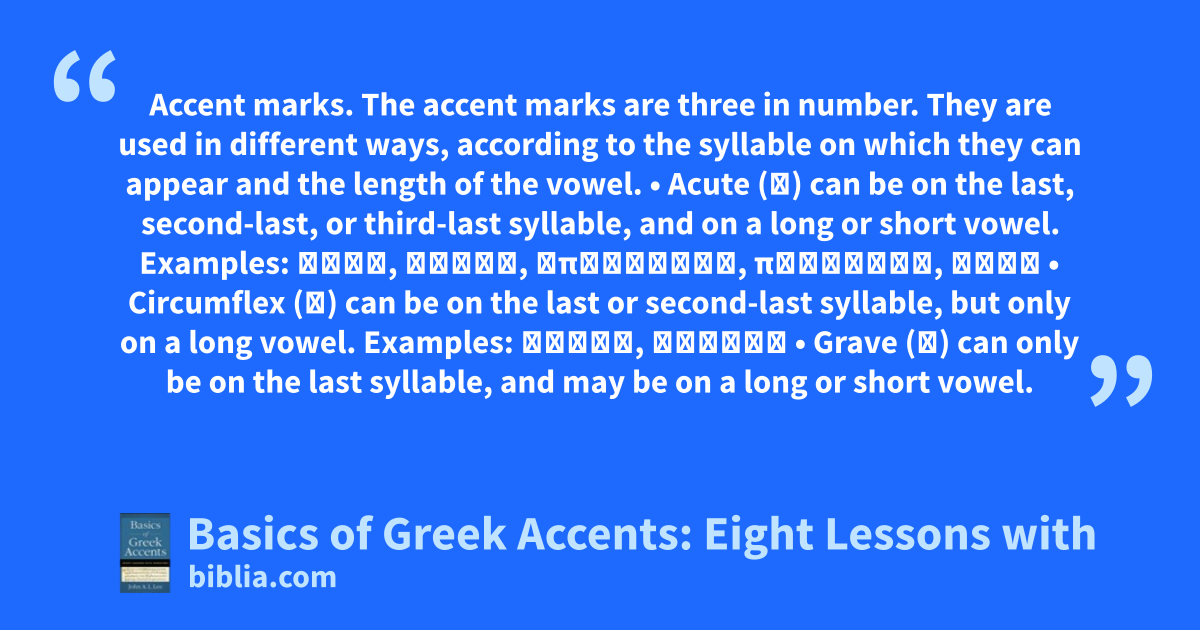 Accent marks. The accent marks are three in number. They are used in different ways, according to the syllable on which they can appear and the length of the vowel. • Acute (ά) can be on the last, second-last, or third-last syllable, and on a long or short vowel. Examples: θεός, λόγος, ἀπόστολος, προφήτης, θεοί • Circumflex (ᾶ) can be on the last or second-last syllable, but only on a long vowel. Examples: καλῶς, δοῦλος • Grave (ὰ) can only be on the last syllable, and may be on a long or short vowel.