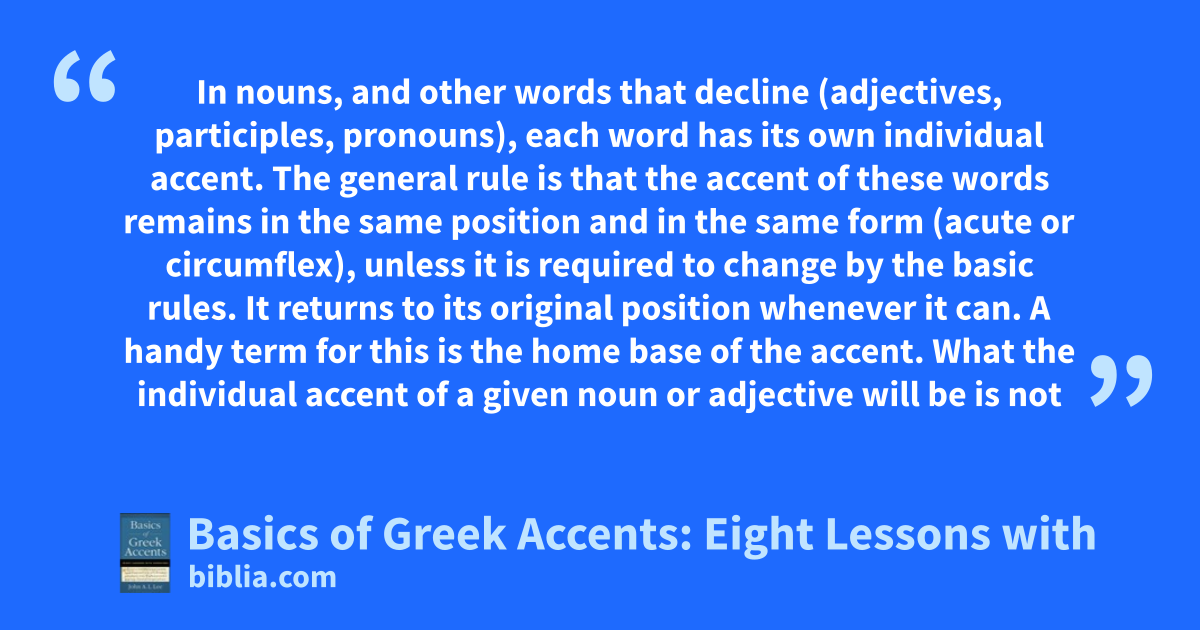 In nouns, and other words that decline (adjectives, participles, pronouns), each word has its own individual accent. The general rule is that the accent of these words remains in the same position and in the same form (acute or circumflex), unless it is required to change by the basic rules. It returns to its original position whenever it can. A handy term for this is the home base of the accent. What the individual accent of a given noun or adjective will be is not