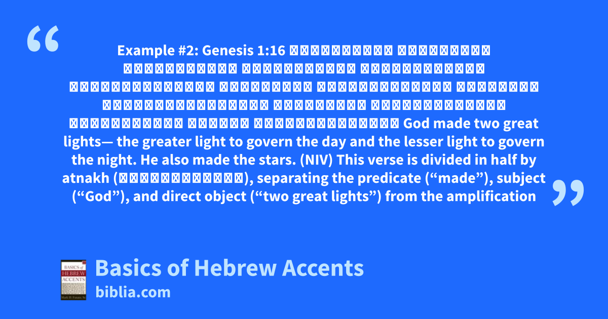 Example #2: Genesis 1:16 וַיַּ֣עַשׂ אֱלֹהִ֔ים אֶת־שְׁנֵ֥י הַמְּאֹרֹ֖ת הַגְּדֹלִ֑ים אֶת־הַמָּא֤וֹר הַגָּדֹל֙ לְמֶמְשֶׁ֣לֶת הַיּ֔וֹם וְאֶת־הַמָּא֤וֹר הַקָּטֹן֙ לְמֶמְשֶׁ֣לֶת הַלַּ֔יְלָה וְאֵ֖ת הַכּוֹכָבִֽים׃ God made two great lights— the greater light to govern the day and the lesser light to govern the night. He also made the stars. (NIV) This verse is divided in half by atnakh (הַגְּדֹלִ֑ים), separating the predicate (“made”), subject (“God”), and direct object (“two great lights”) from the amplification