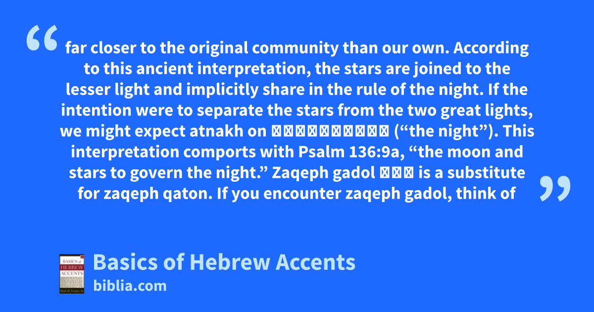 far closer to the original community than our own. According to this ancient interpretation, the stars are joined to the lesser light and implicitly share in the rule of the night. If the intention were to separate the stars from the two great lights, we might expect atnakh on הַלַּיְלָה (“the night”). This interpretation comports with Psalm 136:9a, “the moon and stars to govern the night.” Zaqeph gadol ◌◌֕ is a substitute for zaqeph qaton. If you encounter zaqeph gadol, think of