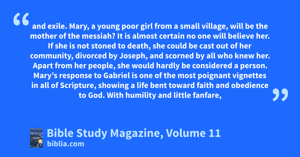 and exile. Mary, a young poor girl from a small village, will be the mother of the messiah? It is almost certain no one will believe her. If she is not stoned to death, she could be cast out of her community, divorced by Joseph, and scorned by all who knew her. Apart from her people, she would hardly be considered a person. Mary’s response to Gabriel is one of the most poignant vignettes in all of Scripture, showing a life bent toward faith and obedience to God. With humility and little fanfare,