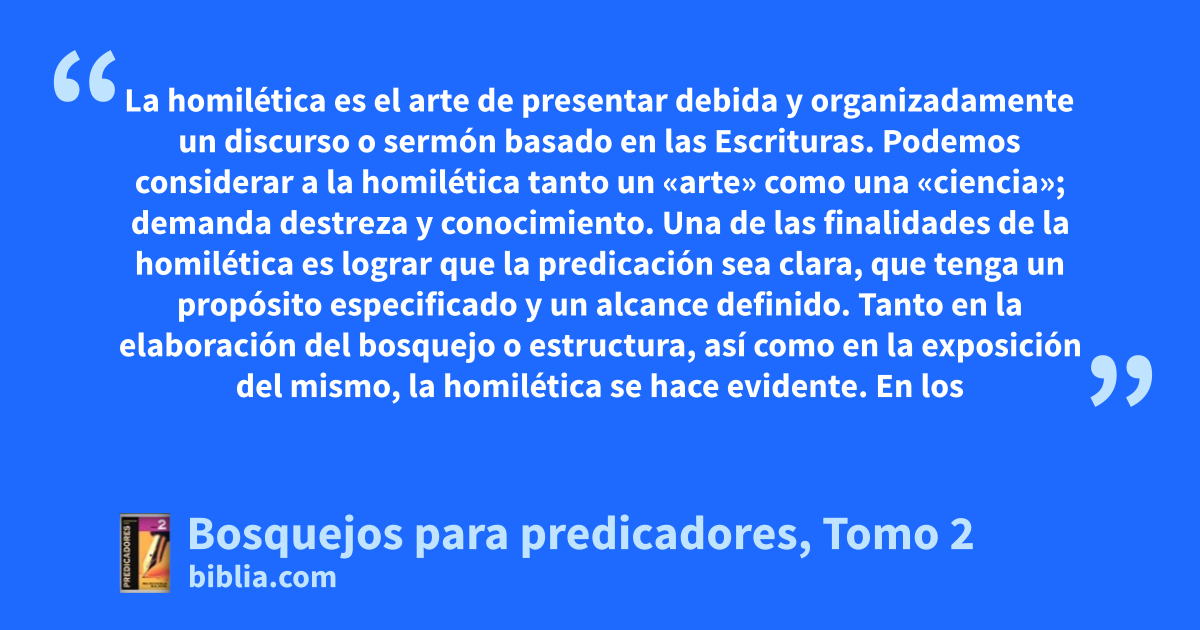 La homilética es el arte de presentar debida y organizadamente un discurso o sermón basado en las Escrituras. Podemos considerar a la homilética tanto un «arte» como una «ciencia»; demanda destreza y conocimiento. Una de las finalidades de la homilética es lograr que la predicación sea clara, que tenga un propósito especificado y un alcance definido. Tanto en la elaboración del bosquejo o estructura, así como en la exposición del mismo, la homilética se hace evidente. En los