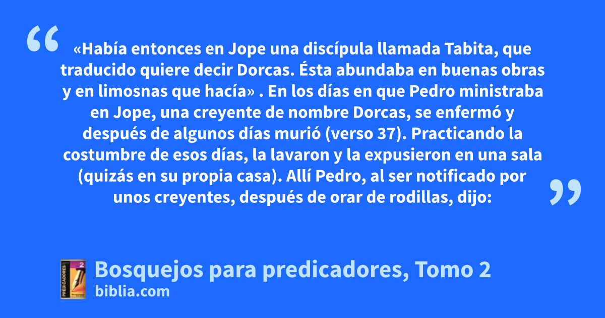«Había entonces en Jope una discípula llamada Tabita, que traducido quiere decir Dorcas. Ésta abundaba en buenas obras y en limosnas que hacía» . En los días en que Pedro ministraba en Jope, una creyente de nombre Dorcas, se enfermó y después de algunos días murió (verso 37). Practicando la costumbre de esos días, la lavaron y la expusieron en una sala (quizás en su propia casa). Allí Pedro, al ser notificado por unos creyentes, después de orar de rodillas, dijo: