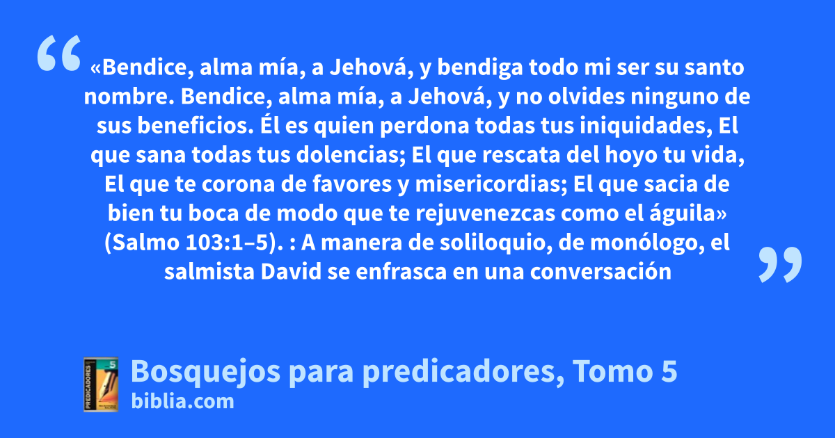 «Bendice, alma mía, a Jehová, y bendiga todo mi ser su santo nombre. Bendice, alma mía, a Jehová, y no olvides ninguno de sus beneficios. Él es quien perdona todas tus iniquidades, El que sana todas tus dolencias; El que rescata del hoyo tu vida, El que te corona de favores y misericordias; El que sacia de bien tu boca de modo que te rejuvenezcas como el águila» (Salmo 103:1–5). : A manera de soliloquio, de monólogo, el salmista David se enfrasca en una conversación