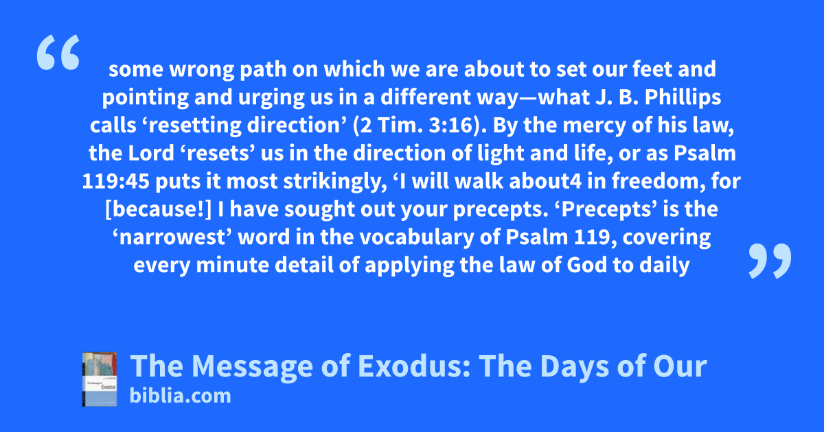 some wrong path on which we are about to set our feet and pointing and urging us in a different way—what J. B. Phillips calls ‘resetting direction’ (2 Tim. 3:16). By the mercy of his law, the Lord ‘resets’ us in the direction of light and life, or as Psalm 119:45 puts it most strikingly, ‘I will walk about4 in freedom, for [because!] I have sought out your precepts. ‘Precepts’ is the ‘narrowest’ word in the vocabulary of Psalm 119, covering every minute detail of applying the law of God to daily