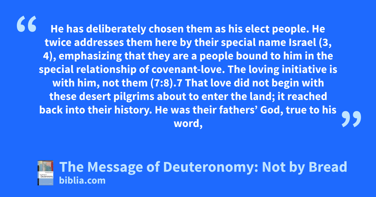He has deliberately chosen them as his elect people. He twice addresses them here by their special name Israel (3, 4), emphasizing that they are a people bound to him in the special relationship of covenant-love. The loving initiative is with him, not them (7:8).7 That love did not begin with these desert pilgrims about to enter the land; it reached back into their history. He was their fathers’ God, true to his word,