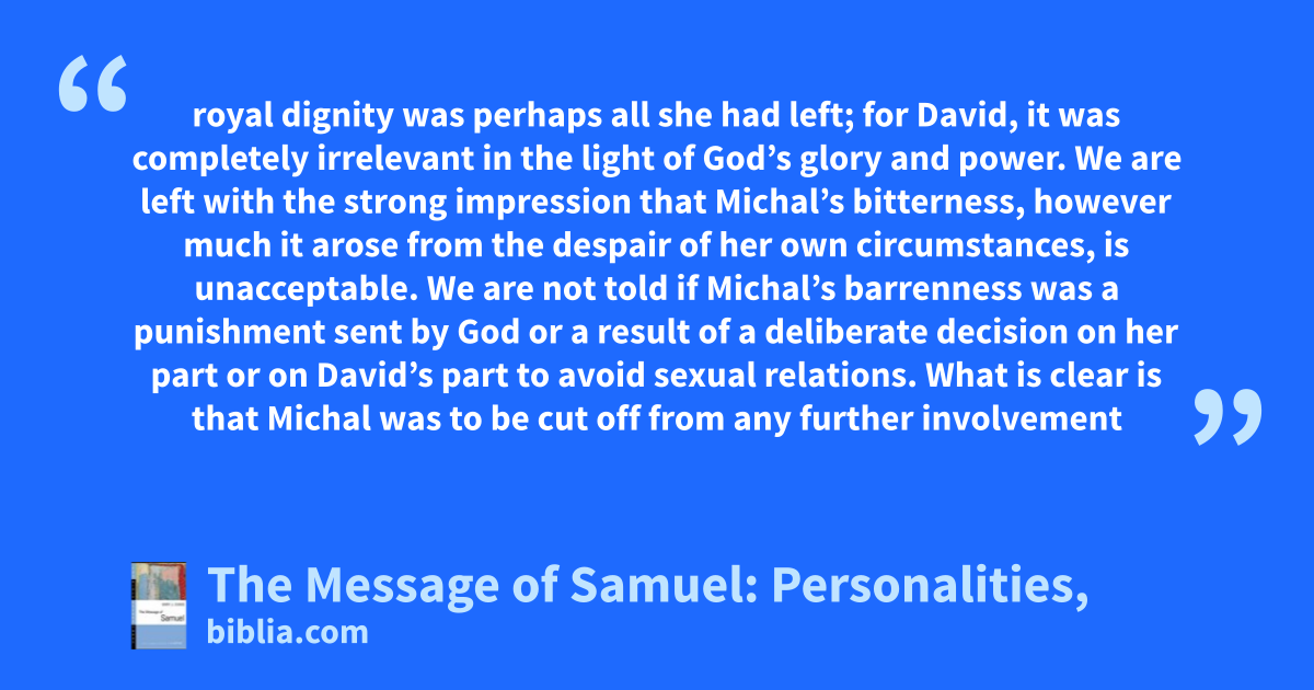royal dignity was perhaps all she had left; for David, it was completely irrelevant in the light of God’s glory and power. We are left with the strong impression that Michal’s bitterness, however much it arose from the despair of her own circumstances, is unacceptable. We are not told if Michal’s barrenness was a punishment sent by God or a result of a deliberate decision on her part or on David’s part to avoid sexual relations. What is clear is that Michal was to be cut off from any further involvement