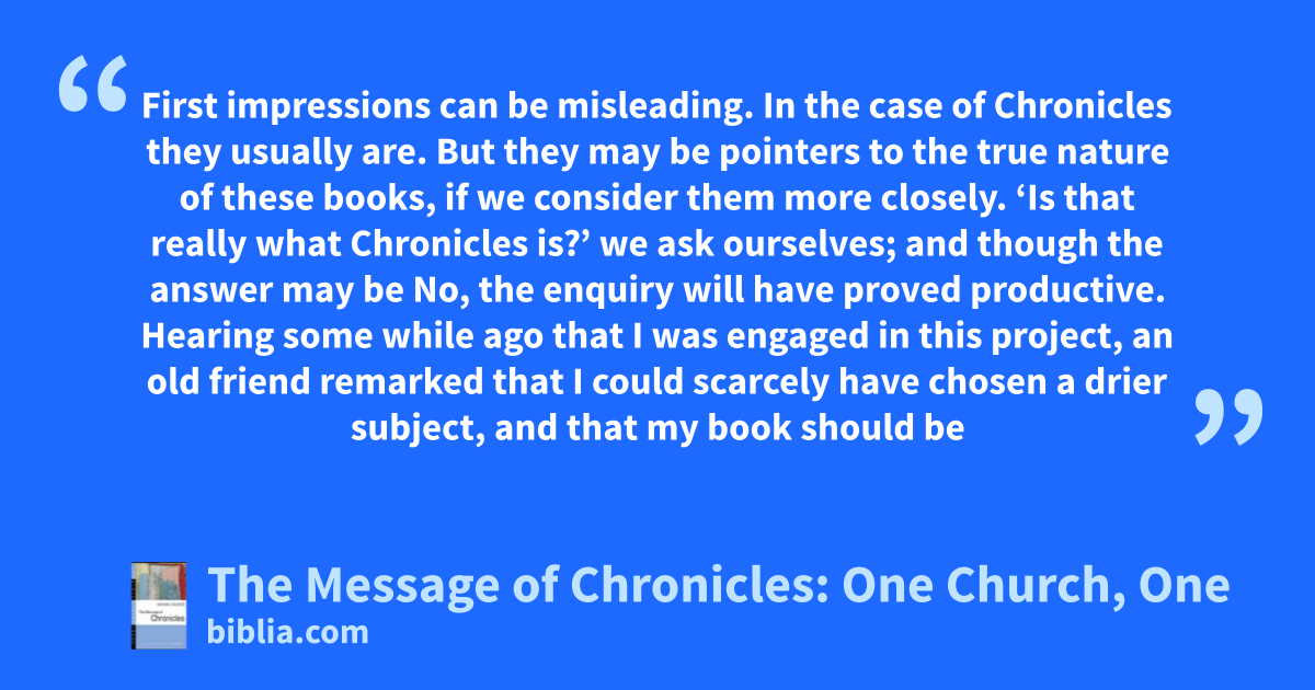 First impressions can be misleading. In the case of Chronicles they usually are. But they may be pointers to the true nature of these books, if we consider them more closely. ‘Is that really what Chronicles is?’ we ask ourselves; and though the answer may be No, the enquiry will have proved productive. Hearing some while ago that I was engaged in this project, an old friend remarked that I could scarcely have chosen a drier subject, and that my book should be