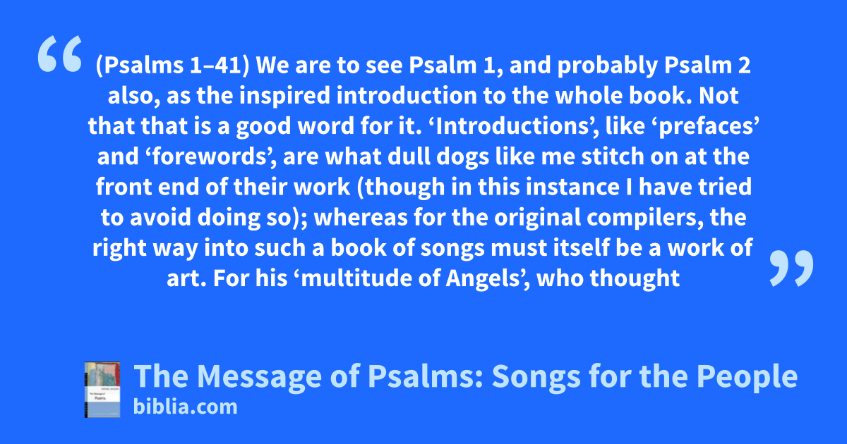 (Psalms 1–41) We are to see Psalm 1, and probably Psalm 2 also, as the inspired introduction to the whole book. Not that that is a good word for it. ‘Introductions’, like ‘prefaces’ and ‘forewords’, are what dull dogs like me stitch on at the front end of their work (though in this instance I have tried to avoid doing so); whereas for the original compilers, the right way into such a book of songs must itself be a work of art. For his ‘multitude of Angels’, who thought