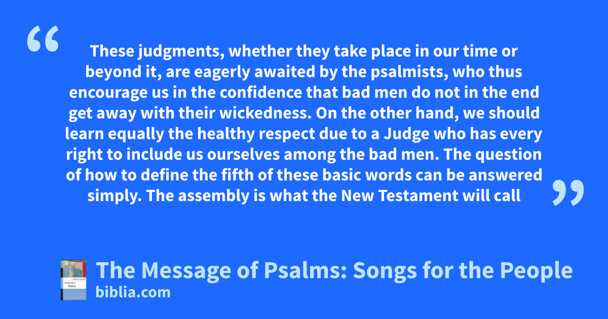 These judgments, whether they take place in our time or beyond it, are eagerly awaited by the psalmists, who thus encourage us in the confidence that bad men do not in the end get away with their wickedness. On the other hand, we should learn equally the healthy respect due to a Judge who has every right to include us ourselves among the bad men. The question of how to define the fifth of these basic words can be answered simply. The assembly is what the New Testament will call