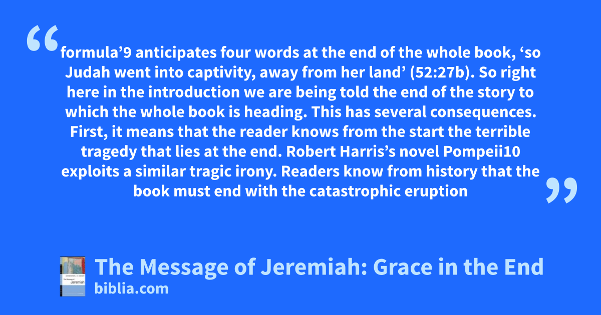 formula’9 anticipates four words at the end of the whole book, ‘so Judah went into captivity, away from her land’ (52:27b). So right here in the introduction we are being told the end of the story to which the whole book is heading. This has several consequences. First, it means that the reader knows from the start the terrible tragedy that lies at the end. Robert Harris’s novel Pompeii10 exploits a similar tragic irony. Readers know from history that the book must end with the catastrophic eruption