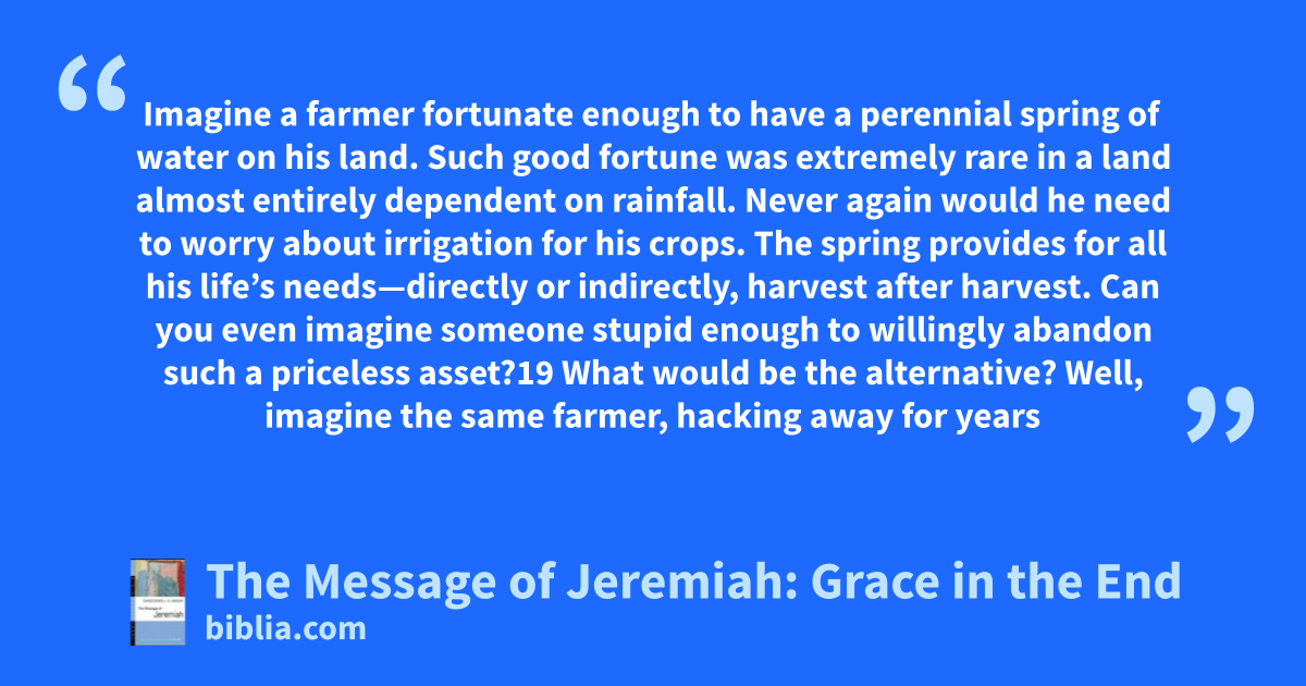 Imagine a farmer fortunate enough to have a perennial spring of water on his land. Such good fortune was extremely rare in a land almost entirely dependent on rainfall. Never again would he need to worry about irrigation for his crops. The spring provides for all his life’s needs—directly or indirectly, harvest after harvest. Can you even imagine someone stupid enough to willingly abandon such a priceless asset?19 What would be the alternative? Well, imagine the same farmer, hacking away for years