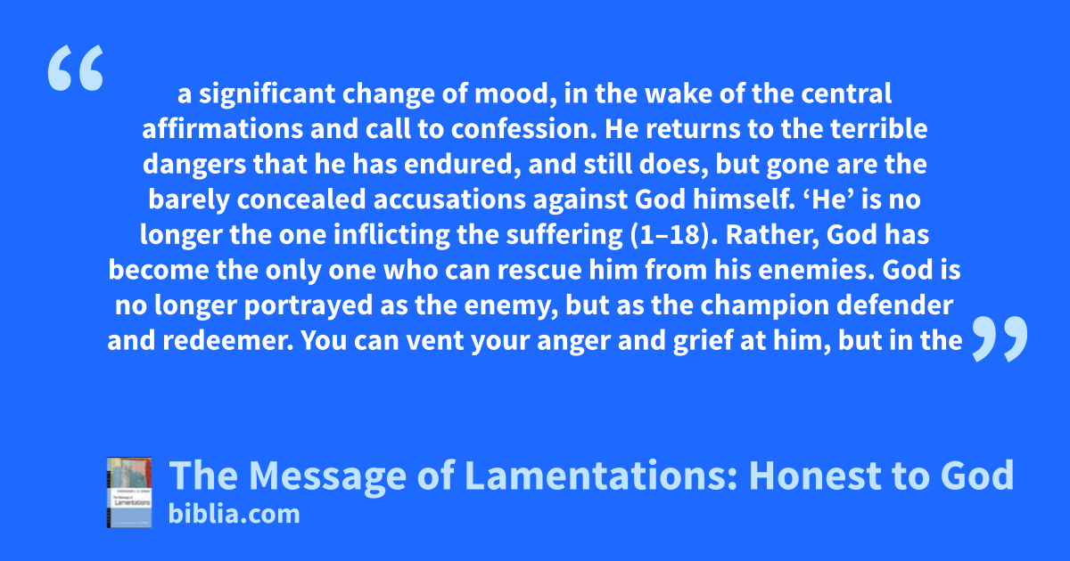 a significant change of mood, in the wake of the central affirmations and call to confession. He returns to the terrible dangers that he has endured, and still does, but gone are the barely concealed accusations against God himself. ‘He’ is no longer the one inflicting the suffering (1–18). Rather, God has become the only one who can rescue him from his enemies. God is no longer portrayed as the enemy, but as the champion defender and redeemer. You can vent your anger and grief at him, but in the