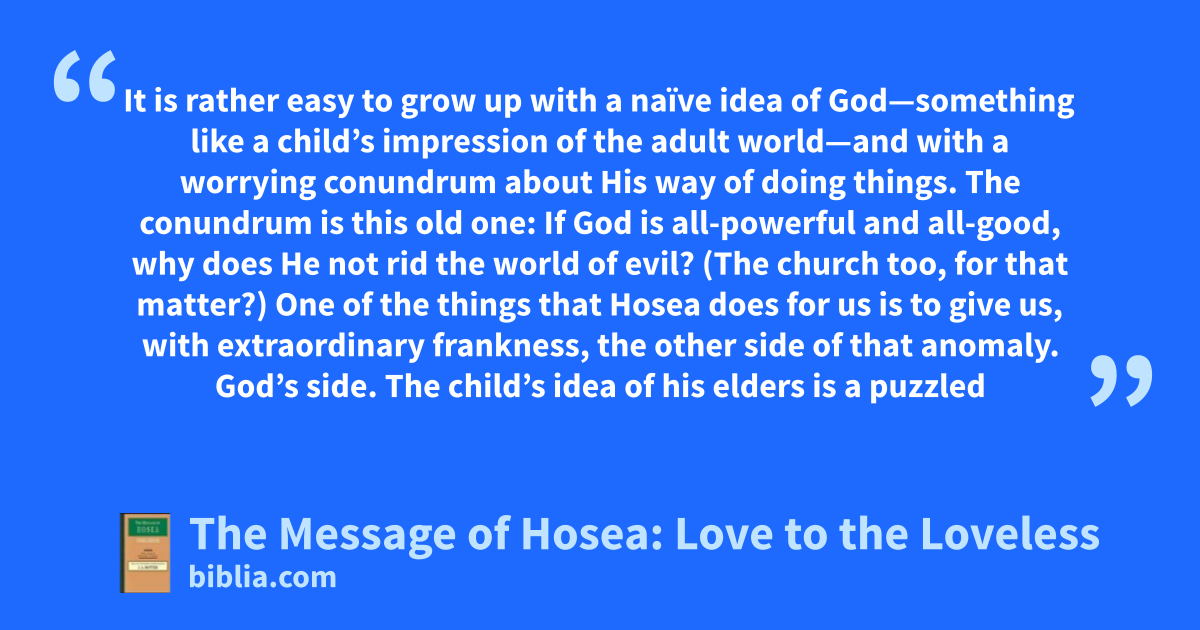 It is rather easy to grow up with a naïve idea of God—something like a child’s impression of the adult world—and with a worrying conundrum about His way of doing things. The conundrum is this old one: If God is all-powerful and all-good, why does He not rid the world of evil? (The church too, for that matter?) One of the things that Hosea does for us is to give us, with extraordinary frankness, the other side of that anomaly. God’s side. The child’s idea of his elders is a puzzled