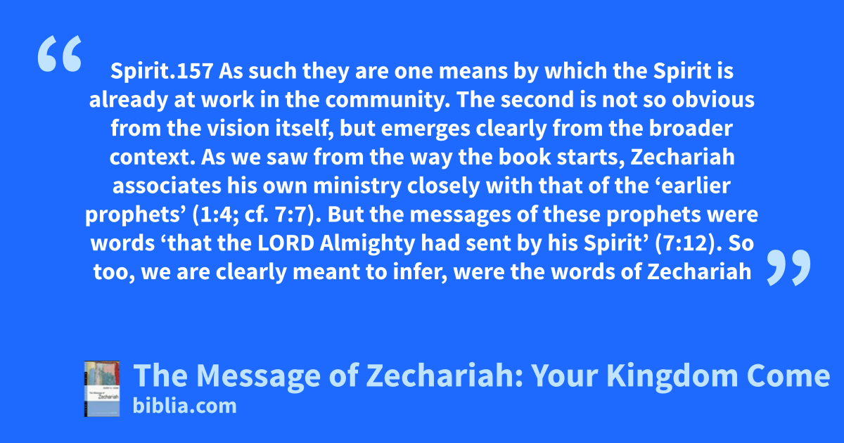 Spirit.157 As such they are one means by which the Spirit is already at work in the community. The second is not so obvious from the vision itself, but emerges clearly from the broader context. As we saw from the way the book starts, Zechariah associates his own ministry closely with that of the ‘earlier prophets’ (1:4; cf. 7:7). But the messages of these prophets were words ‘that the LORD Almighty had sent by his Spirit’ (7:12). So too, we are clearly meant to infer, were the words of Zechariah