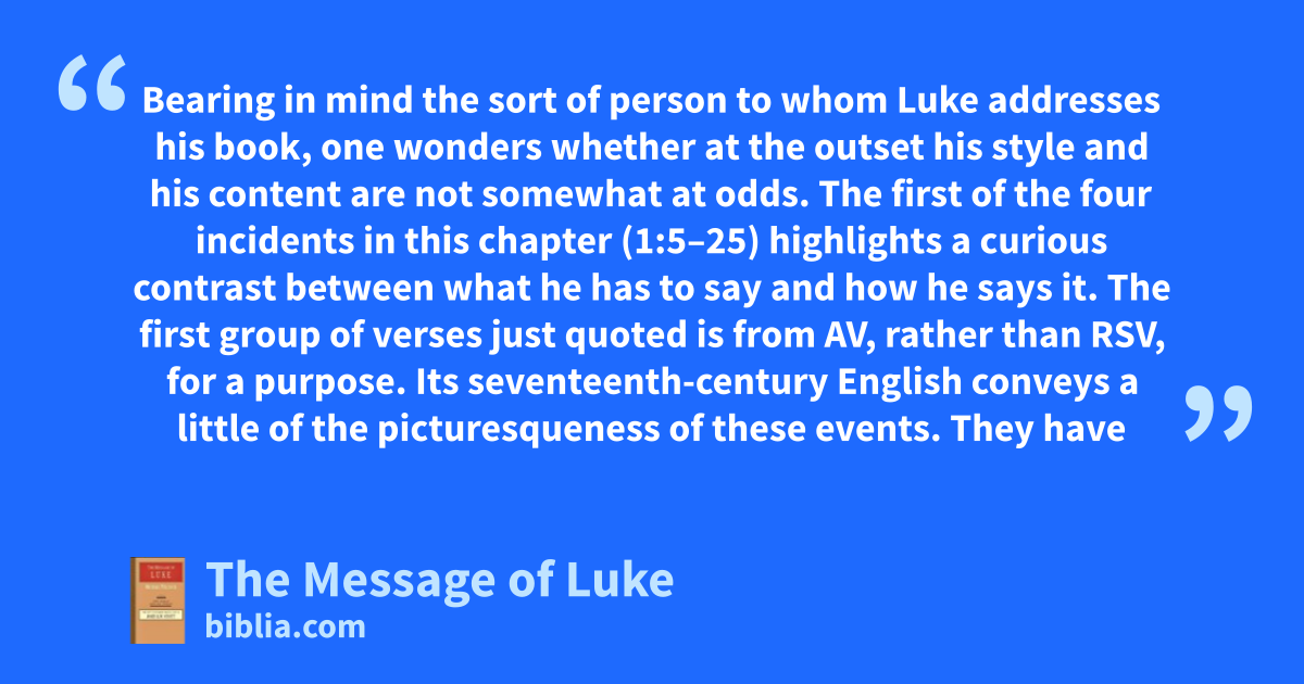 Bearing in mind the sort of person to whom Luke addresses his book, one wonders whether at the outset his style and his content are not somewhat at odds. The first of the four incidents in this chapter (1:5–25) highlights a curious contrast between what he has to say and how he says it. The first group of verses just quoted is from AV, rather than RSV, for a purpose. Its seventeenth-century English conveys a little of the picturesqueness of these events. They have