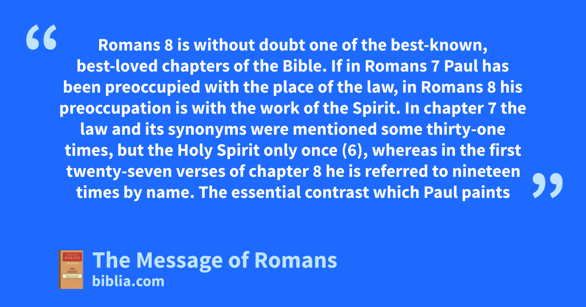 Romans 8 is without doubt one of the best-known, best-loved chapters of the Bible. If in Romans 7 Paul has been preoccupied with the place of the law, in Romans 8 his preoccupation is with the work of the Spirit. In chapter 7 the law and its synonyms were mentioned some thirty-one times, but the Holy Spirit only once (6), whereas in the first twenty-seven verses of chapter 8 he is referred to nineteen times by name. The essential contrast which Paul paints